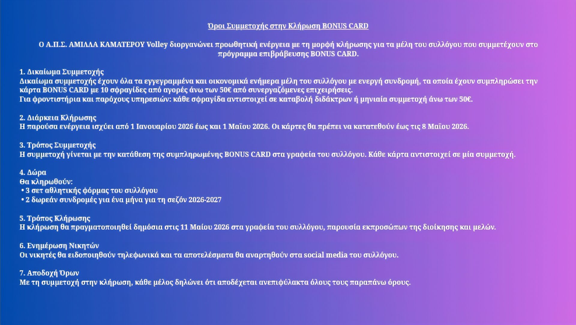 Η BONUS CARD διατίθεται αποκλειστικά από το γραφείο του συλλόγου.